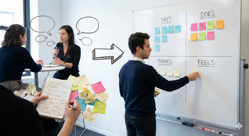 同理心地圖是一個視覺化框架,把你從訪談(或其他管道)得到的使用者資訊,有系統地整理成四個區塊:說什麼、做什麼、想什麼、感受什麼。